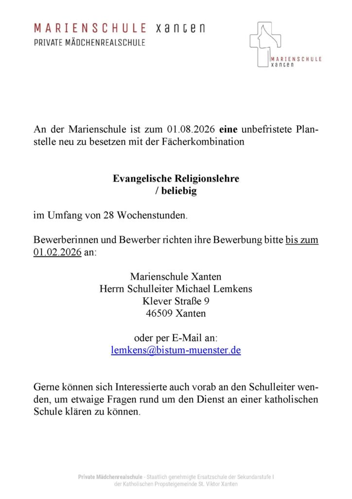 An der Marienschule ist zum 01.08.2026 eine unbefristete Planstelle neu zu besetzen mit der Fächerkombination: